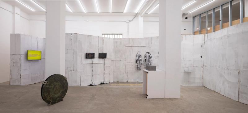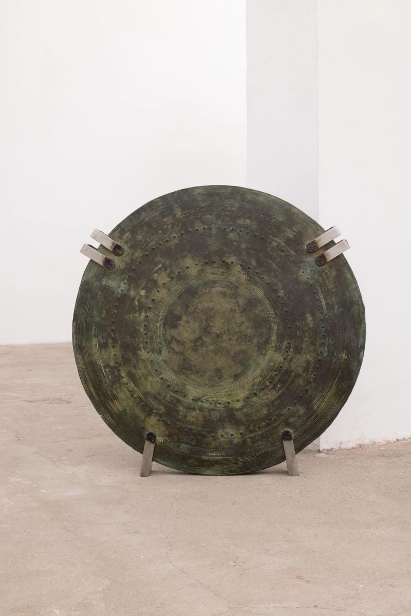 Il dialogo sembra, al contrario, funzionare tra l’opera di Fujiwara e quella di Alessandro Di Pietro (TO WONG, 2017?), unico artista italiano della mostra. L’opera, composta da due enormi scudi di bronzo che proteggono una bobina cinematografica, richiama esplicitamente l’immaginario archeologico proprio del contesto italiano. Si tratta però di un’archeologia che guarda tanto al Mediterraneo quanto al futuro – all’archeologia dei media. Proveniente dal Museo MADRE di Napoli, l’opera di Di Pietro appare, almeno inizialmente, come la meno esplicitamente politica del percorso. Eppure, è proprio nell’atto di alludere, nel lasciare che il significato emerga senza mai dichiararsi completamente, che talvolta si insinua un forte gesto politico. In un presente in cui si torna a parlare di censura, TO WONG parla delle urgenti istanze di Hong Kong e si riferisce, senza mai esplicitarlo, all’oppositore politico Joshua Wong, condannato nel 2017. Questo lavoro si inserisce a sua volta nel più ampio ciclo che Di Pietro ha dedicato a Paul Thek e gioca con il tempo e con la storia, immaginandone sviluppi alternativi: io forse avrei potuto essere su un treno per Genova, se Paul Thek fosse stato vivo per poter realizzare quest’opera.