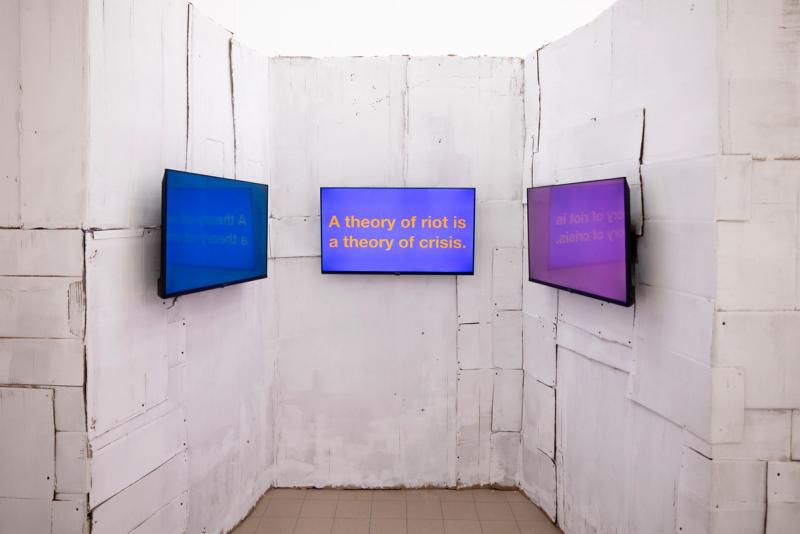 Altrettanto valida risulta la scelta di esporre l’installazione video multicanale di Tony Cokes sulla relazione degli scontri di Los Angeles del 1992 con il contesto internazionale (The World Won’t Listen II, 2026). L’opera riesce infatti a dialogare con i lavori di Tiffany Sia, contribuendo a ricostruire il teso tessuto sociale, occidentale e non solo, a cavallo fra gli anni Novanta e Duemila.