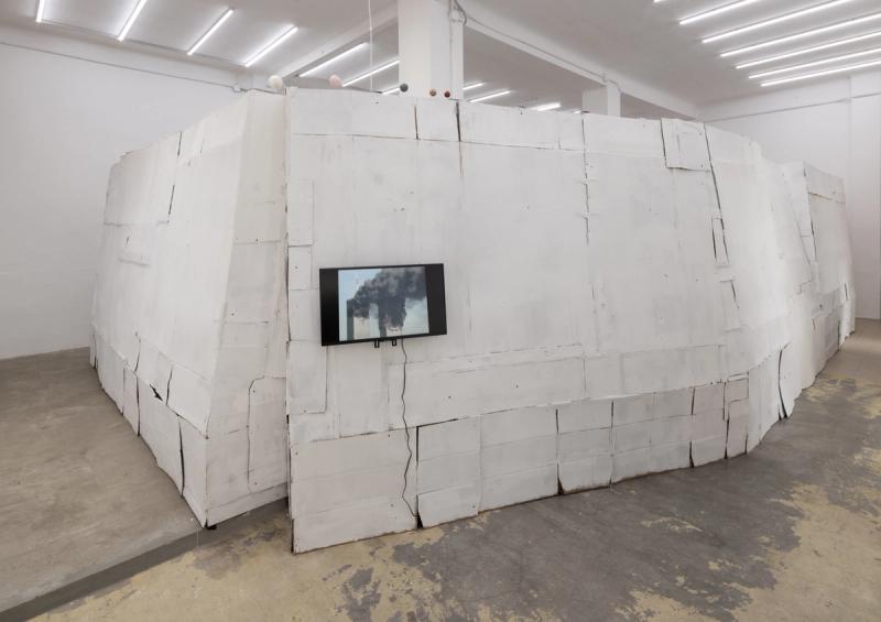 Quando si entra in uno spazio espositivo non ci si aspetta di venir fermati da un muro. Ci si aspetterebbe, in teoria, che una galleria o un museo siano, per propria natura, accessibili. È sorprendente quanto questo tema sia invece dibattuto e controverso, tra mediazione culturale e museum fatigue. Tuttavia, non è ai dibattiti museologici che faccio riferimento quando, in una primavera milanese, varco l’ingresso di una galleria con l’intento di visitarla. Mi trovo di fronte a un muro bianco: una barricata, oserei dire. Un grande arco che mi blocca ancora prima di poter osservare, come se lo spazio che sto varcando stesse cercando di proteggersi dalla mia intrusione. Una sorta di chiusura a riccio. Entro e circumnavigo questa architettura ostile. La mia mente da storica dell’arte comincia subito a costruire la propria mappa mentale di rimandi e paragoni – Richard Serra e il suo noto Tilted Arc. Ma c’è qualcosa che, paradossalmente, mi appare ancora più familiare.