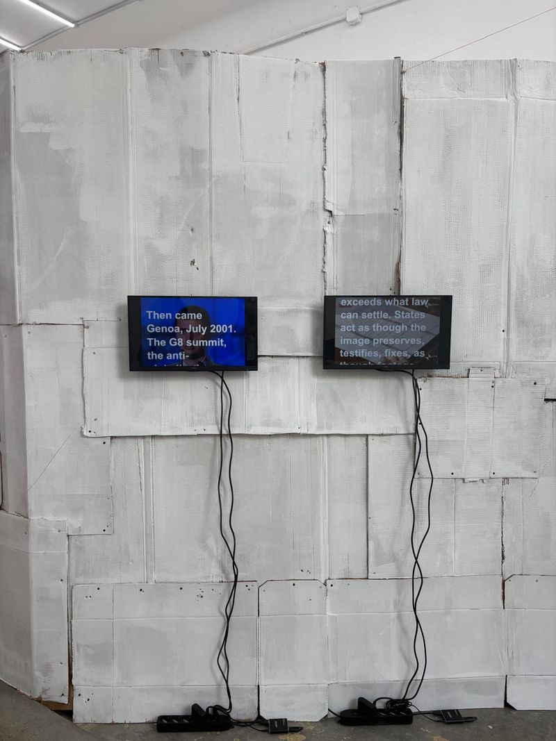 Ciò nonostante, la mostra mantiene i suoi intenti più militanti nella proposta di alcune opere il cui potenziale sovversivo resta intatto. Mi riferisco soprattutto ai lavori di Tiffany Sia (Scroll Figure #5 e Scroll Figure #6, 2026). Due schermi presentano immagini provenienti dal repertorio della televisione berlusconiana, attraversate da un testo in sovraimpressione a scorrimento che, in netto contrasto con quelle immagini, denuncia apertamente le conseguenze politiche e sociali del governo Berlusconi. Anche qui si torna a Genova. Le immagini di Mediaset sono giustapposte a una denuncia ferma e diretta delle scelte che hanno portato ai fatti del G8 e alla morte di Carlo Giuliani. È un accostamento che funziona: mentre il testo scorre, i volti patinati della televisione italiana appaiono sempre più paradossali, talmente cerosi che la loro finzione risulta drammatica tanto quanto gli eventi richiamati da Sia.