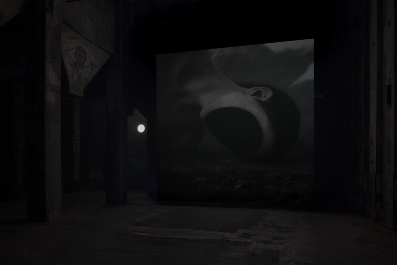 Oltre la biglietteria e i primi pannelli informativi, una ripida scala immetteva nello spazio enorme chiamato Halle, il “salone” tenebroso e spoglio che occupa circa metà del famoso edificio. Tra i pilastri monumentali, uno schermo colossale gettava bagliori intermittenti sulle pareti con l’intonaco lacero e strani graffiti e sul pubblico, ossequiente verso l’unica fonte luminosa dopo tanto buio e freddo. Tuttavia la visione dei 50 minuti (in loop) di Liminals non dava un gran sollievo: si trattava di una austera animazione digitale, iperrealistica, di uno scabro paesaggio minerale affacciato su un abisso in cui si susseguono i gesti muti e interrotti di una figura femminile senza volto. Sibili e boati irriconoscibili, amplificati in vibrazioni penetranti, culminavano un allestimento impeccabilmente lugubre.
