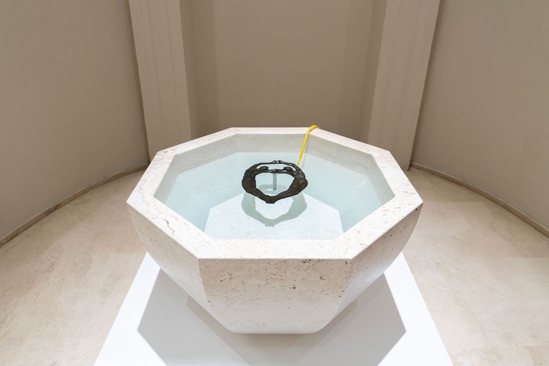 Andreoni presenta un’opera inedita intitolata Un tout sans fin: in una grande fonte battesimale risuona la voce registrata di Claudia Cardinale che intona Sinnò me moro, la ballata composta da Carlo Rustichelli per il film di Pietro Germi Un Maledetto Imbroglio. All’interno di questo contenitore ottagonale, realizzato in travertino marchigiano, galleggia una piccola scultura di bronzo (appartenuta all’attrice) che sembra quasi danzare sulle note della Cardinale. È un lavoro che posiziona l’installazione su un piano virtuale, immaginativo, e che produce un illuminante cortocircuito di memorie.